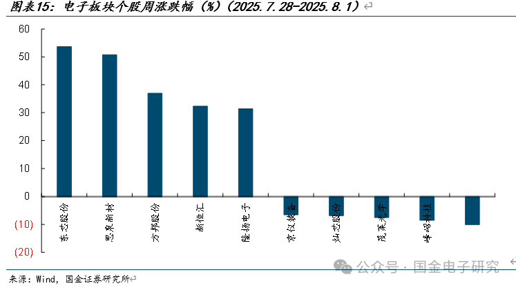 从个股情况来看,本周东芯股份、思泉新材、方邦股份、新恒汇、隆扬电子为涨幅前五大公司,涨幅分别为53.68%、50.75%、36.99%、32.34%、31.44%。跌幅前五为京仪装备、灿芯股份、茂莱光学、峰岹科技、波长光电,跌幅分别为-6.53%、-6.78%、-7.47%、-8.50%、-10.06%。