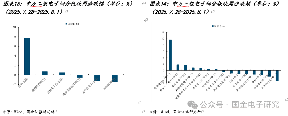 在电子细分板块中,涨跌幅前三大细分板块为印制电路板、模拟芯片设计、分立器件,涨跌幅分别为9.65%、1.83%、1.73%。涨跌幅靠后的三大细分板块为面板、半导体材料、半导体设备,涨跌幅分别为-1.37%、-1.89%、-3.32%。