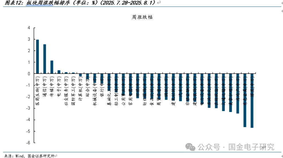 板块行情回顾 ]article_adlist-->回顾本周行情,参考申万一级行业划分,涨跌幅前三名的行业分别为生物医药、通信、传媒,涨跌幅分别为2.95%、2.54%、1.13%。涨跌幅后三位为房地产、有色金属、煤炭,涨跌幅分别为-3.43%、-4.62%、-4.67%。本周电子行业涨跌幅为0.28%。